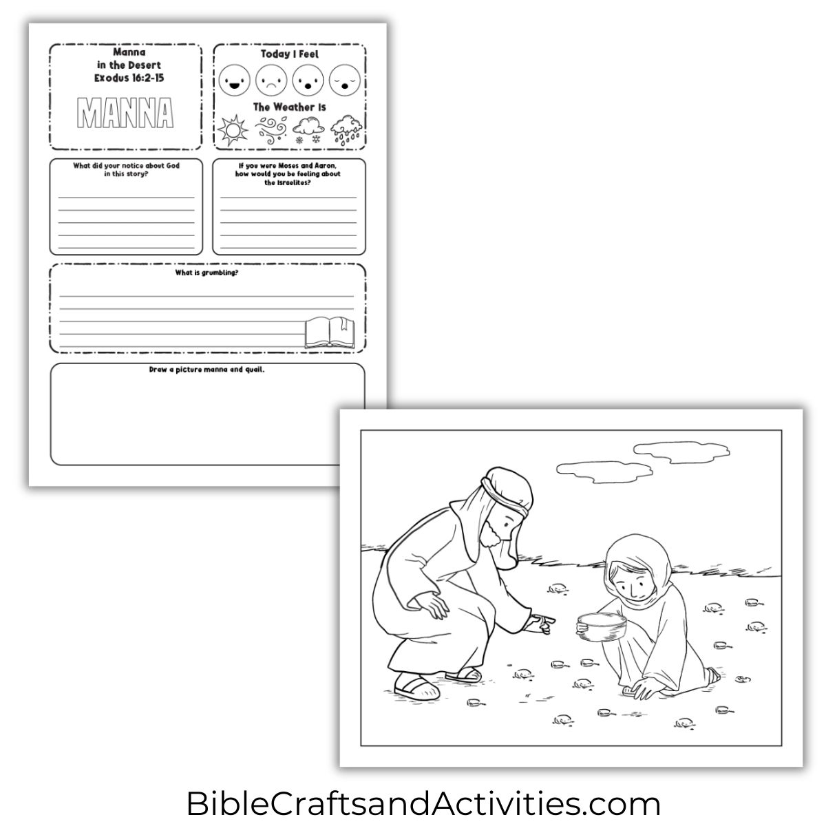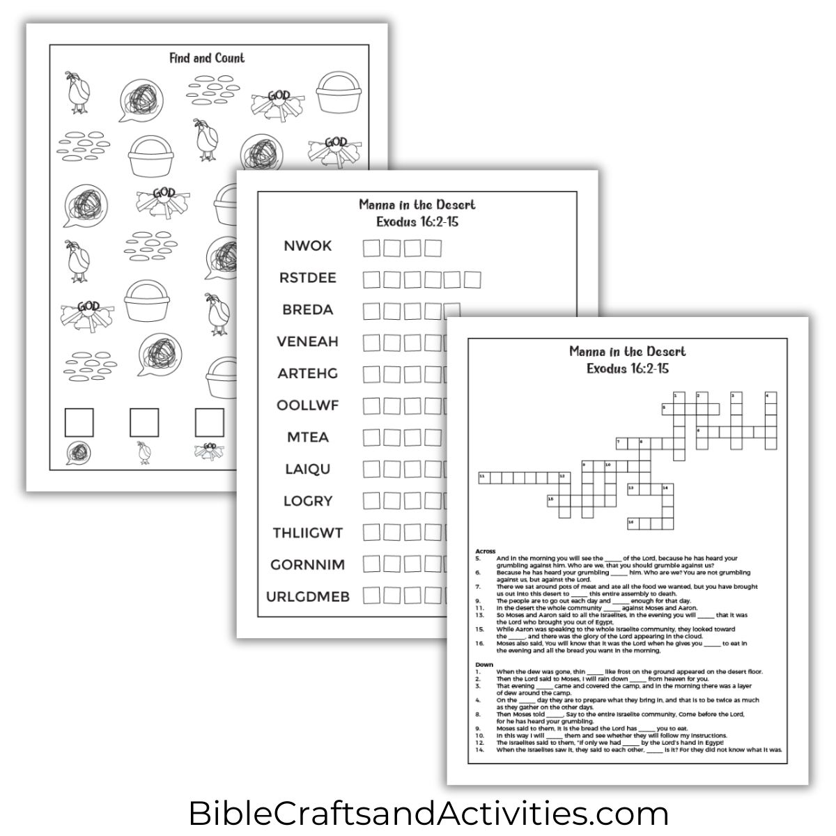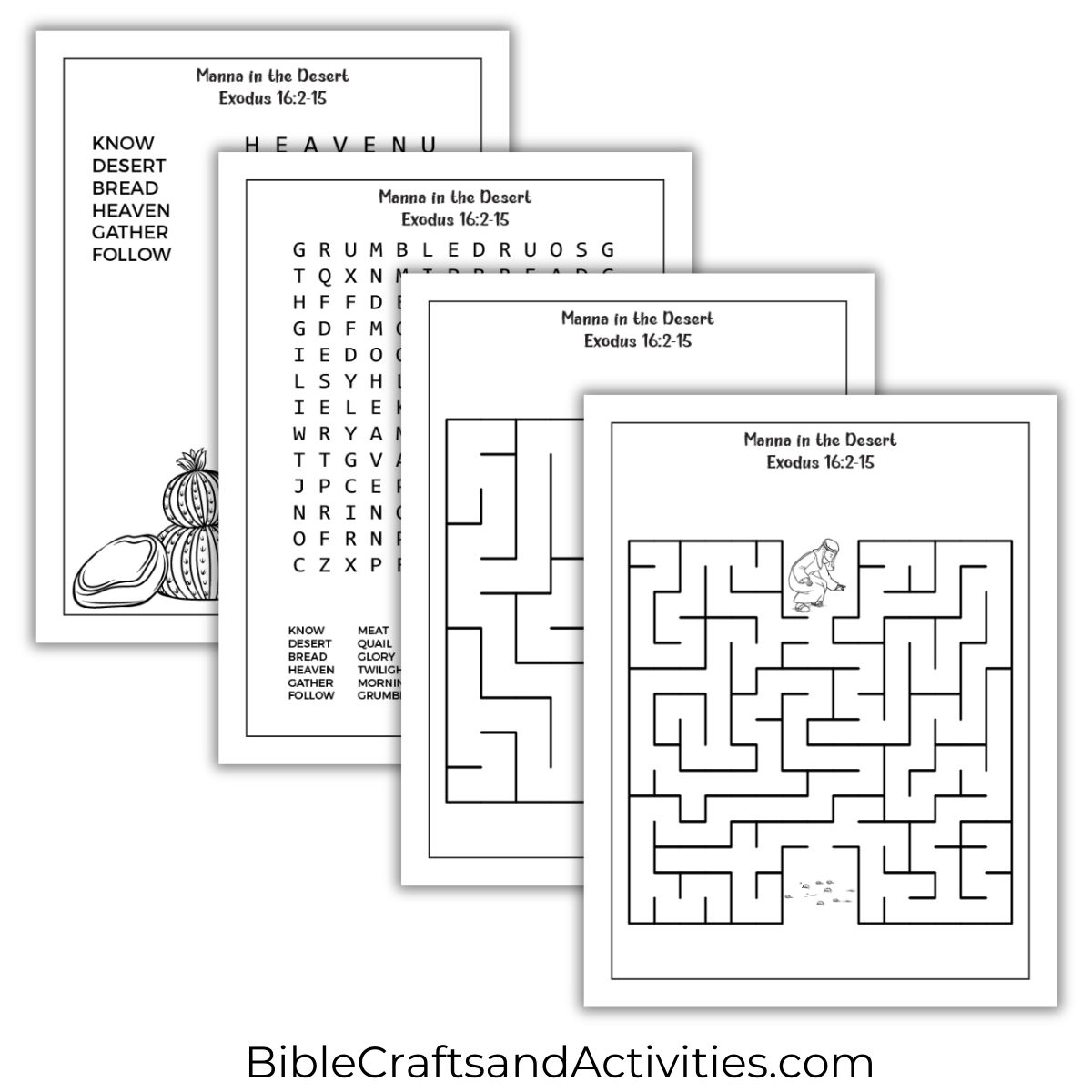 This set of activity pages for Exodus 16:2-15 illustrates the story of God Giving the Israelites Manna in the Desert.