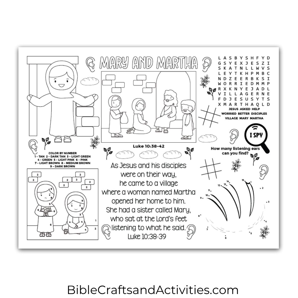 Mary and Martha lesson activity sheet is just right for parents, Sunday school teachers, or anyone looking to combine faith, fun, and learning on a single page! This lesson follows the text found in Luke 10:38-42 and illustrates the story of Jesus’ visit to the home of Mary, Martha, and Lazarus in Bethany.