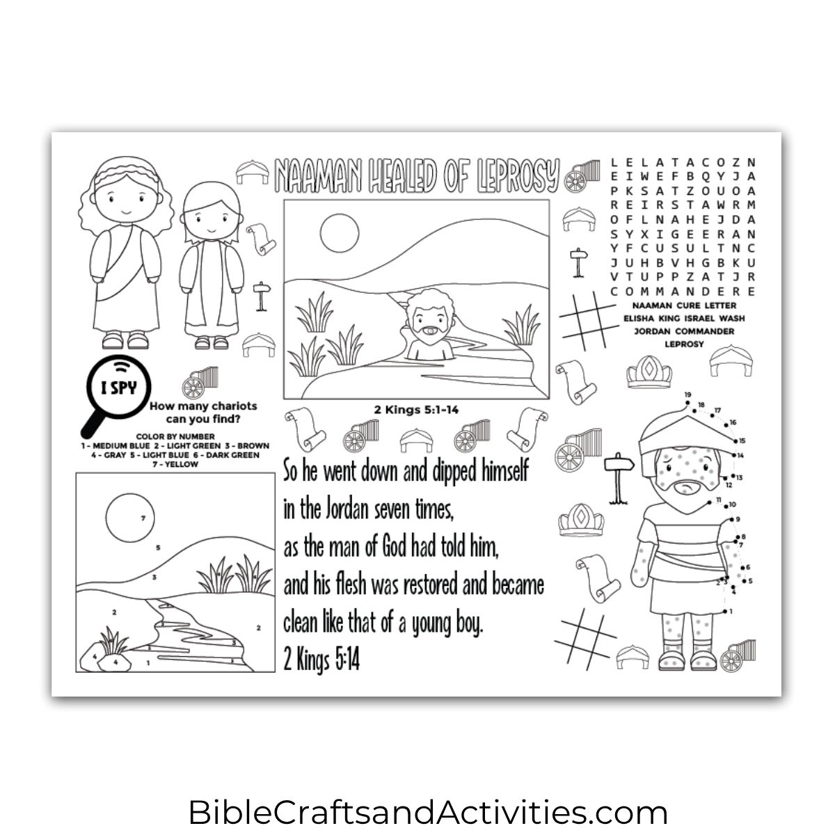 Naaman Healed of Leprosy lesson activity sheet is just right for parents, Sunday school teachers, or anyone looking to combine faith, fun, and learning on a single page! This lesson follows the text found in 2 Kings 5:1-14 and illustrates Naaman being healed in the Jordan River.