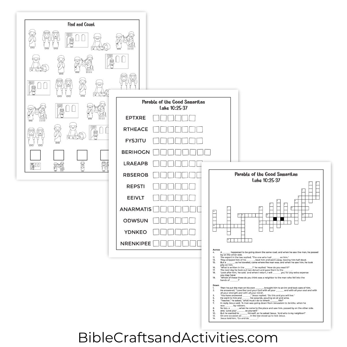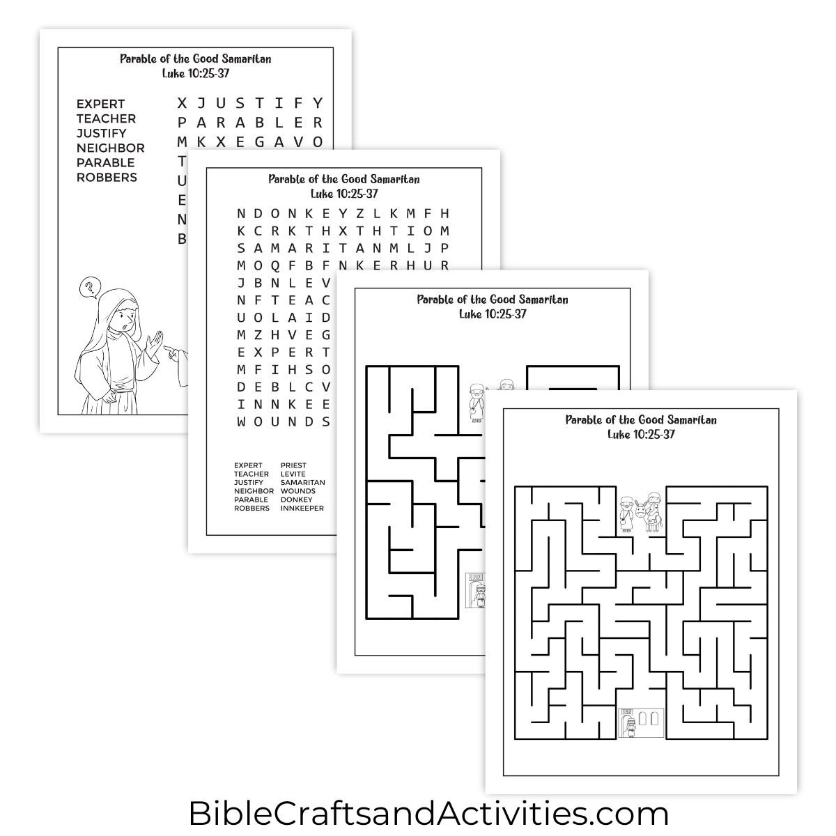 The text for this set of activity pages is found in Luke 10:25-37 and provides activities for the Parable of the Good Samaritan. Activities include: