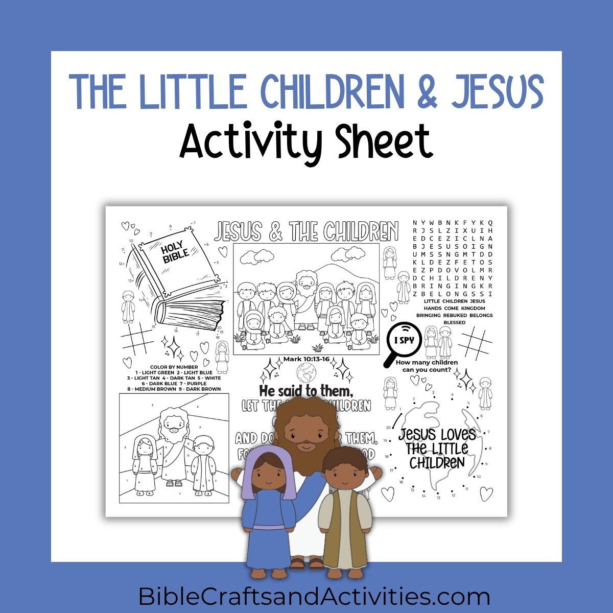 The Little Children and Jesus lesson activity sheet is just right for parents, Sunday school teachers, or anyone looking to combine faith, fun, and learning on a single page! This lesson follows the text found in Mark 10:13-16 illustrating the story of Jesus welcoming and blessing the children.