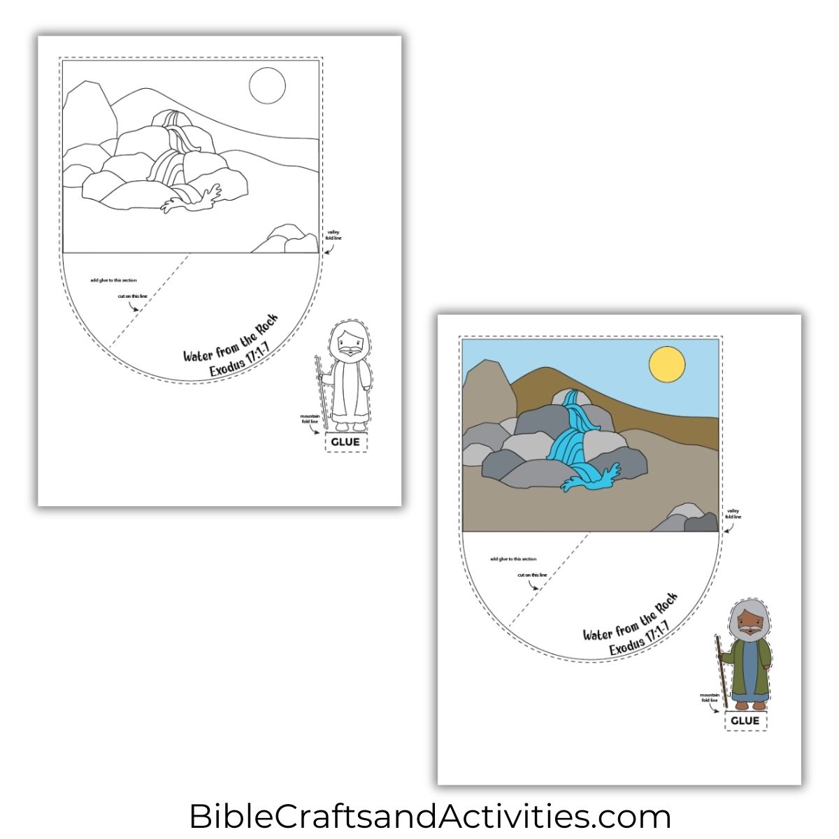 Enjoy this printable diorama craft for Exodus 17:1-7 illustrating the story of God providing water from the rock in response to the Israelites’ complaints and Moses’ plea.